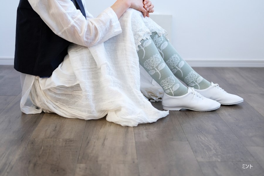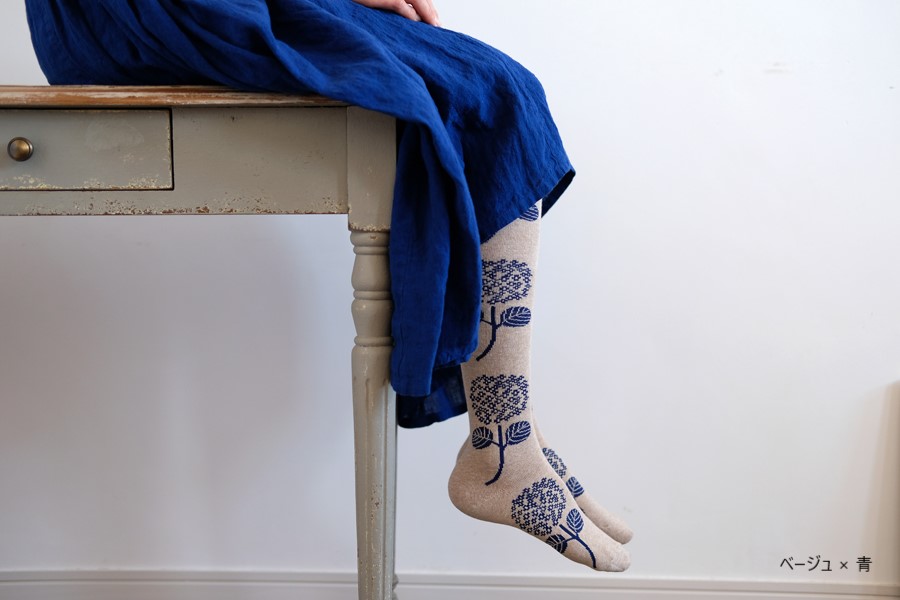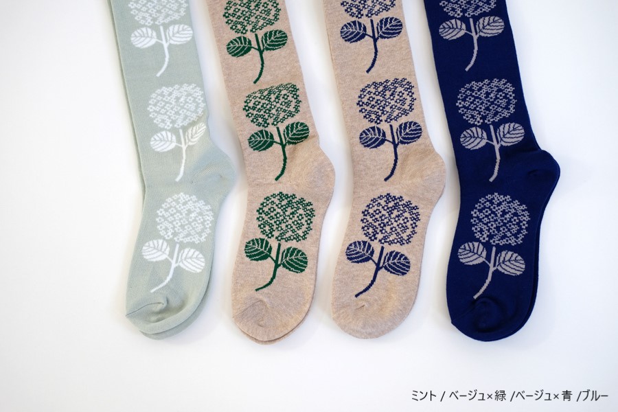 大輪のアジサイを両サイドに施した、印象的なハイソックスです。冷房で足元の冷えが気になる時などでも、 快適に履いていただけるコットン素材を採用しました。