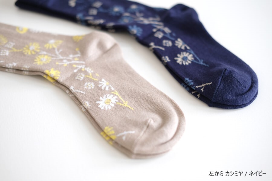 この靴下は可憐な野菊を全体に配置してあり、ナチュラルな装いがお好みの方におすすめです。(11月の誕生花)