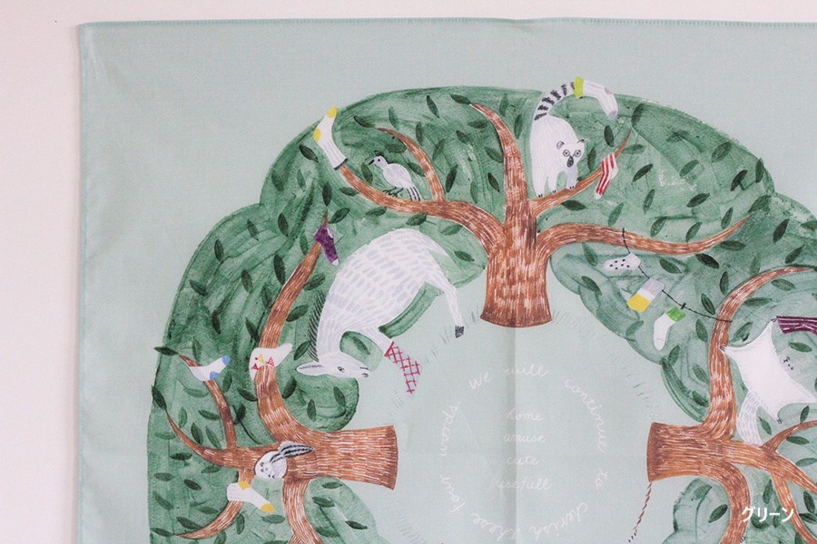 環になった木々、森の動物たちが思い思いに靴下を履いています。