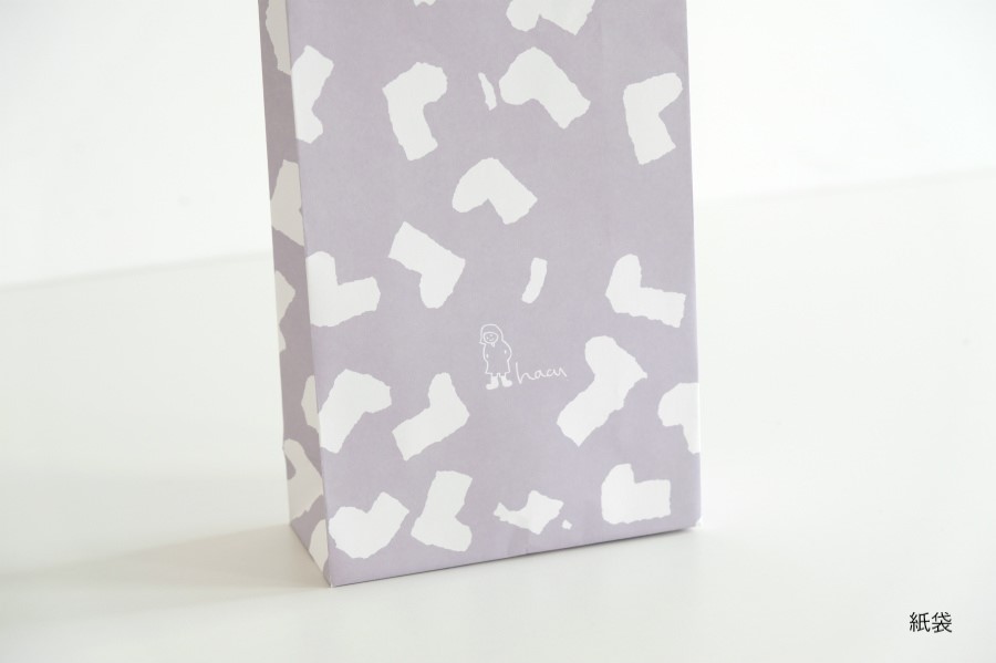 落ち着いたグレーにホワイトの印字が入った、味わいのある上質紙を使用したhacu オリジナルのラッピングと、紙袋のセットオプションです。