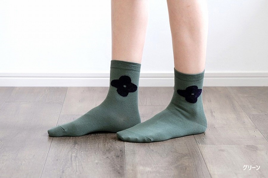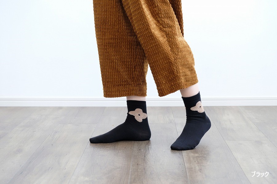 ボディは綿素材、花の部分には、アクリル・レーヨンの滑らかな肌触りのモール糸を使用しています。柄に立体感がでて異素材使いの面白さが際立つ1足です。