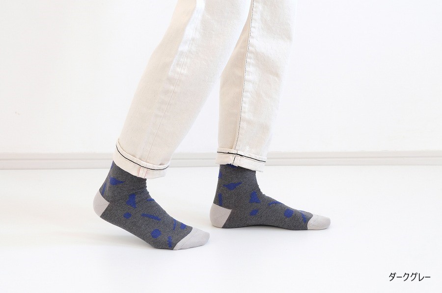 毛羽立ちの少ない綿の糸をボディに使用し、柄部分は綿麻素材を使用しているので、素材の違いを楽しめる一足に。