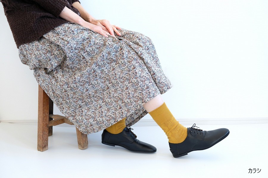 履き口のリブ部分を長く編み立てていますので、少したるませたり、ひとつ折り返したり、いろいろ表情を変えて楽しめます。