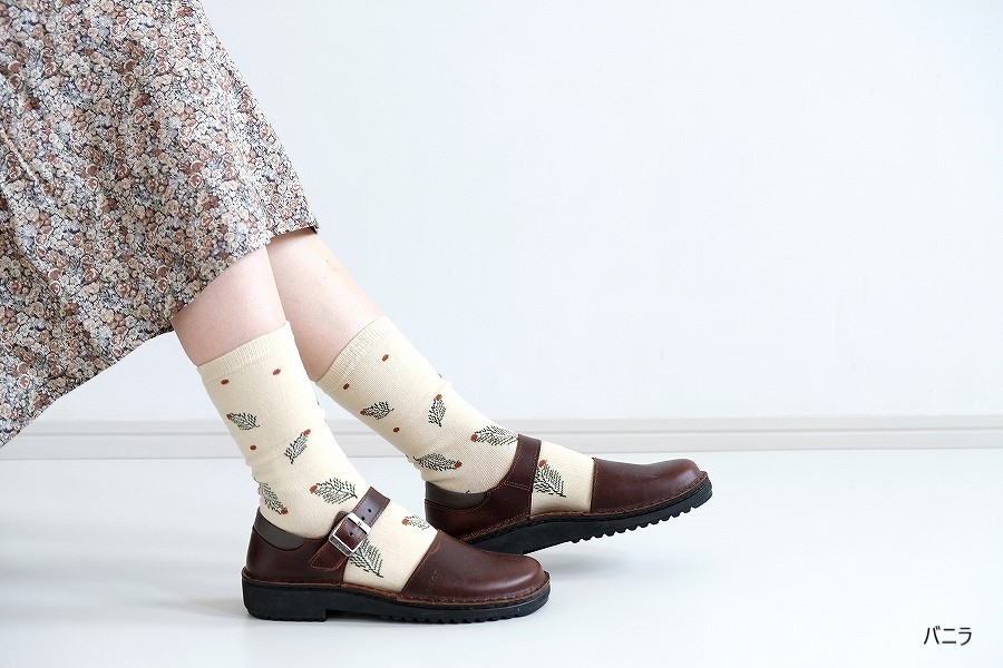 もみの木の先端のモチーフとドットを、所々に散りばめたデザインが可愛い一足です。ベースカラーは控えめで、洋服に合わせやすいカラーになっています。