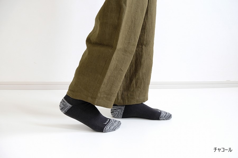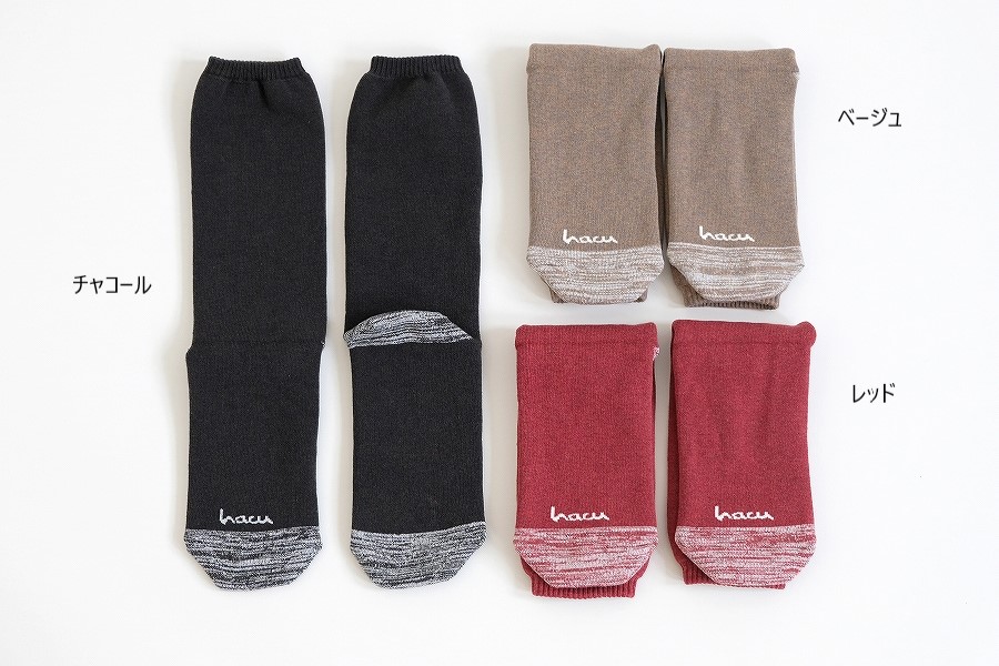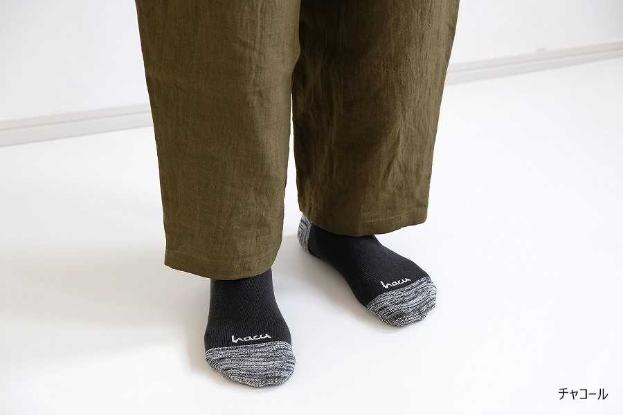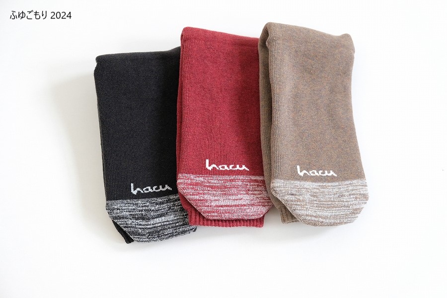 ハイゲージパイル機で緻密に編み立てた、耐久性ばっちりな「ふゆごもり 2024」は、秋冬の時期にふさわしいボディカラーに、つま先とかかとにランダムなラインをプラスした、シンプルでちょっとかわいい「hacu」らしいルームソックスです。