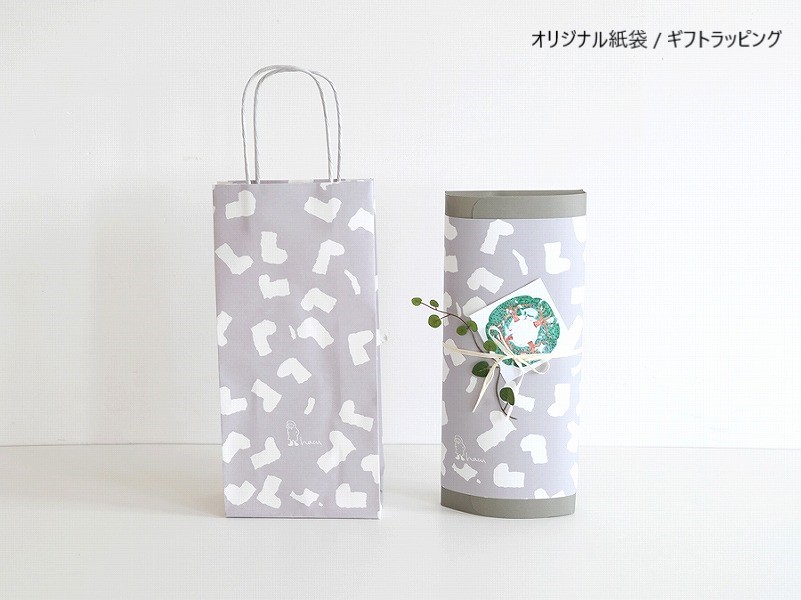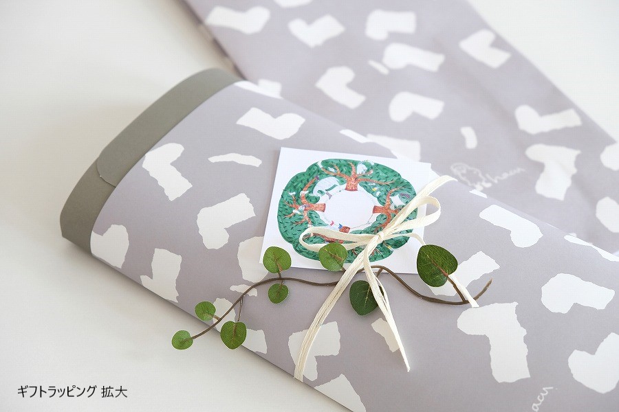 ・hacuのオリジナルラッピングに、靴下の柄の掛け紙をかけて専用紙袋にお入れします。