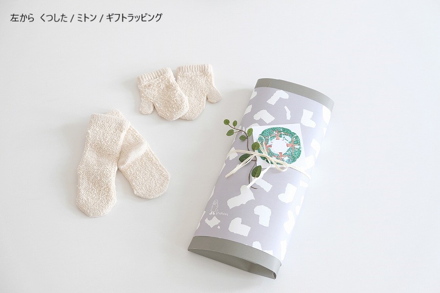 オーガニックコットンと空気をふんだんに織り込んだ、やさしい肌心地の「くつした」と「ミトン」をセットにして、hacuオリジナルのシンプルラッピングで丁寧にお包みしました。