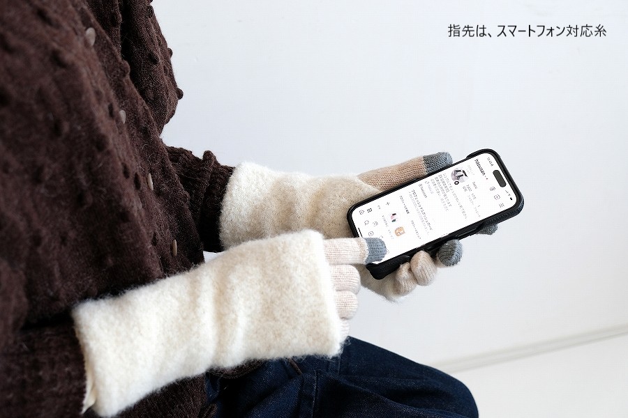親指・人差し指・中指の先端には、スマートフォン対応糸を使用し、つけたままの操作もスムーズで、寒い日のお出かけや通勤時にも快適です。