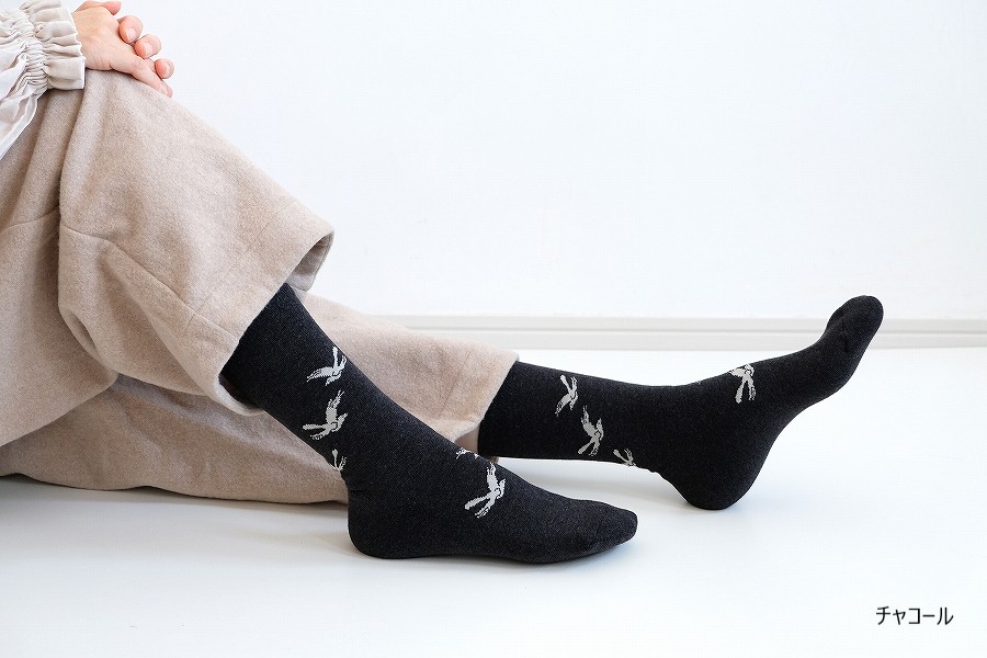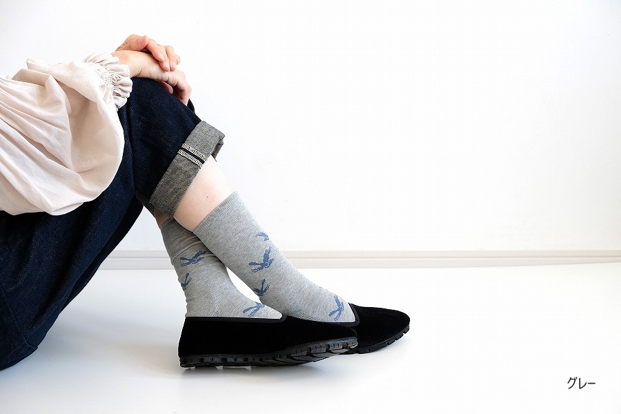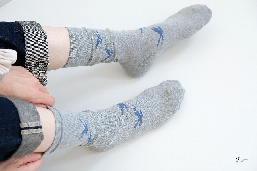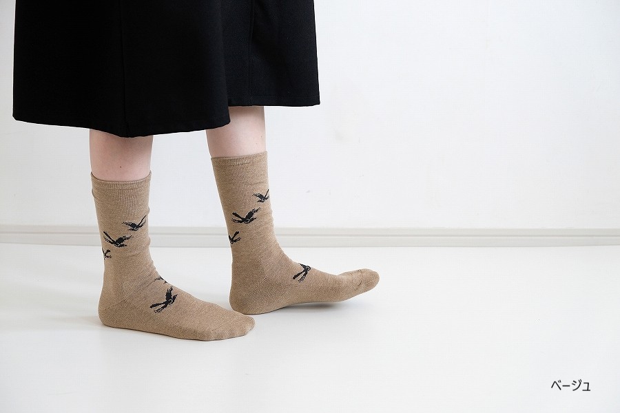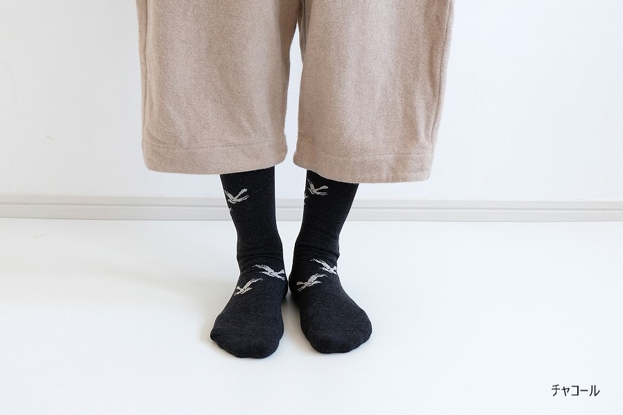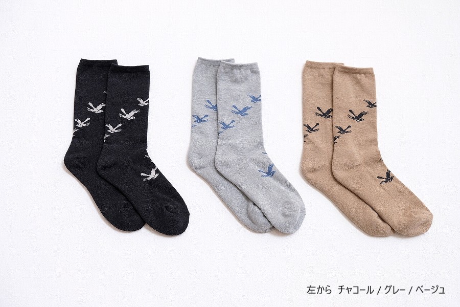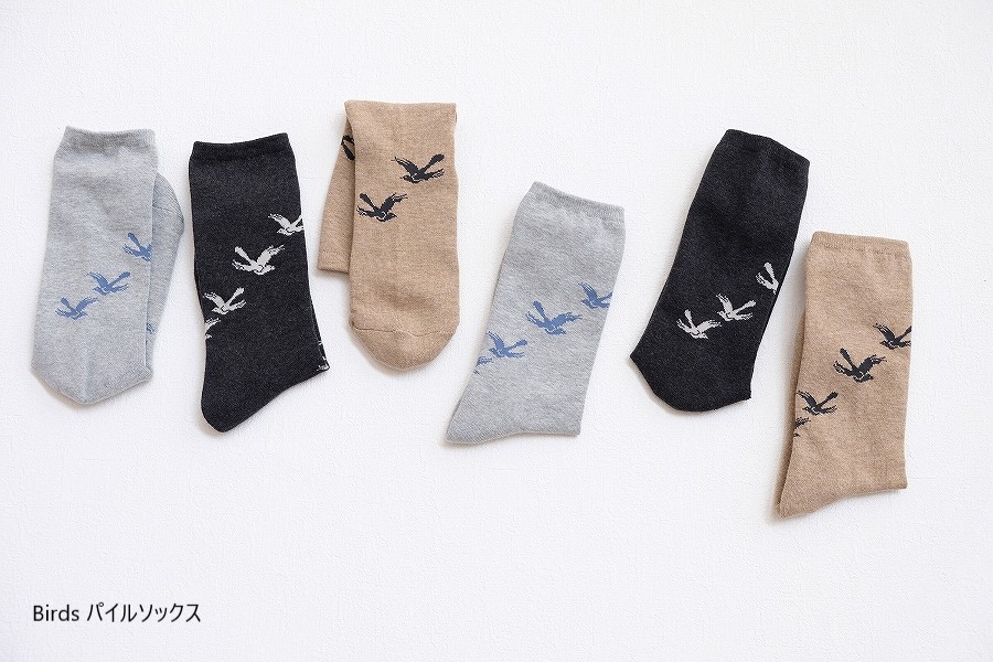 空を翔ける鳥たちの連なりを、モチーフにしたデザインのパイルソックスです。