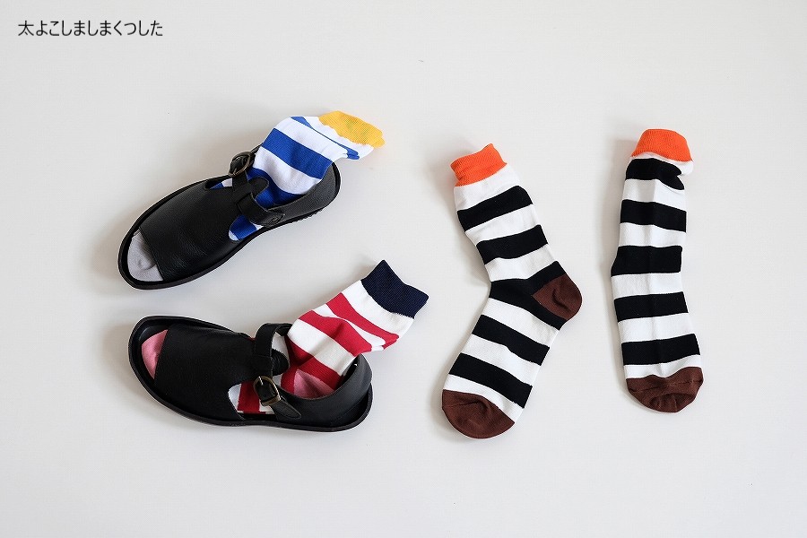 存在感のある太めのボーダーが特徴の一足、名前は見た目のとおり「太よこしましまくつした」。