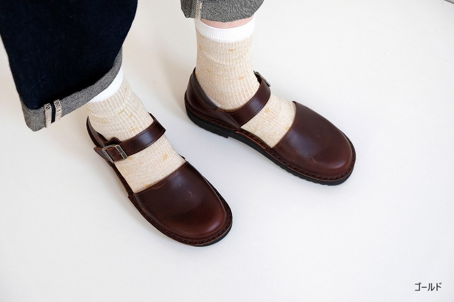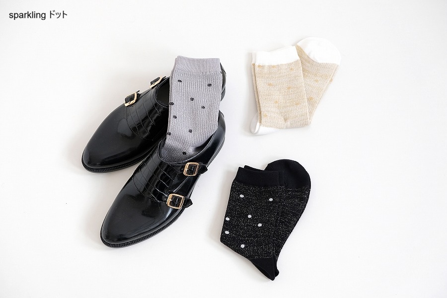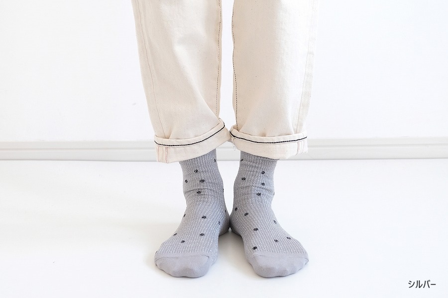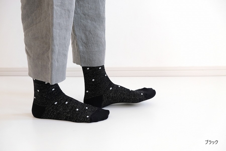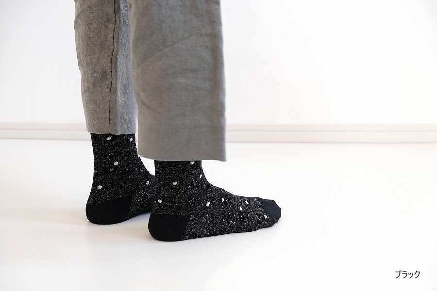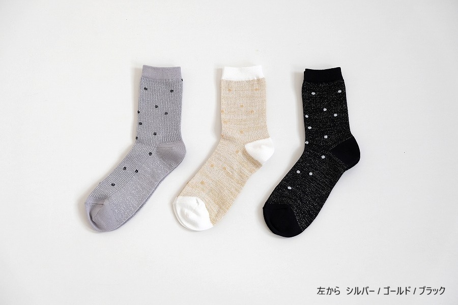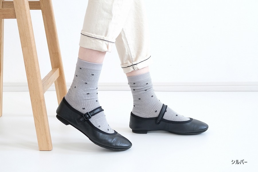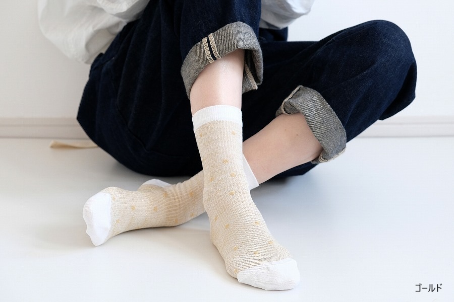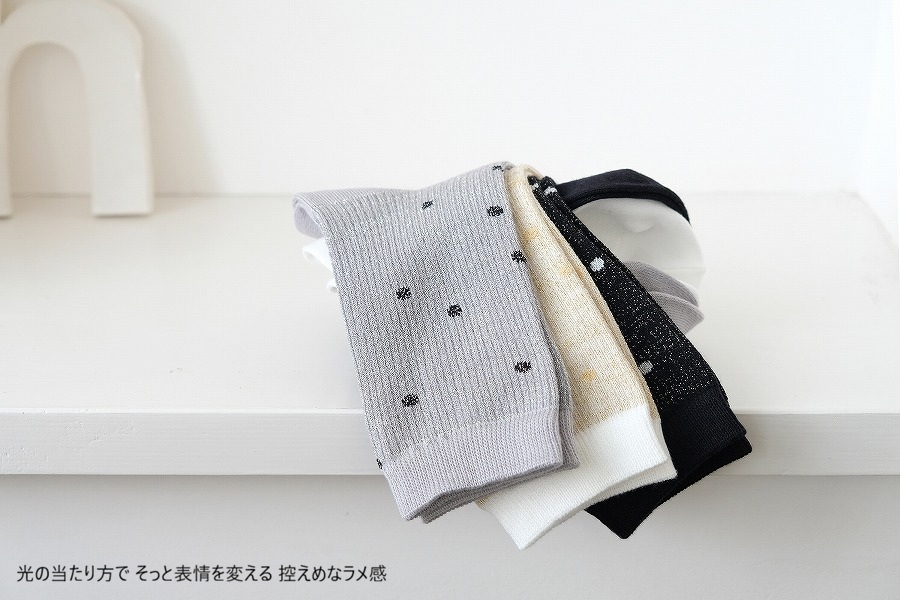コットンとラメ糸を、引きそろえて編みたてたドット柄の靴下「sparkling ドット」。